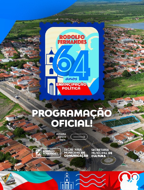 ??? A Prefeitura de Rodolfo Fernandes, por meio da Secretaria Municipal de Cultura e Turismo, tem a honra de apresentar a programação oficial em comemoração aos 64 anos de emancipação política do nosso município. Um momento especial para celebrar nossa história, conquistas e o orgulho de ser rodolfo-fernandense.